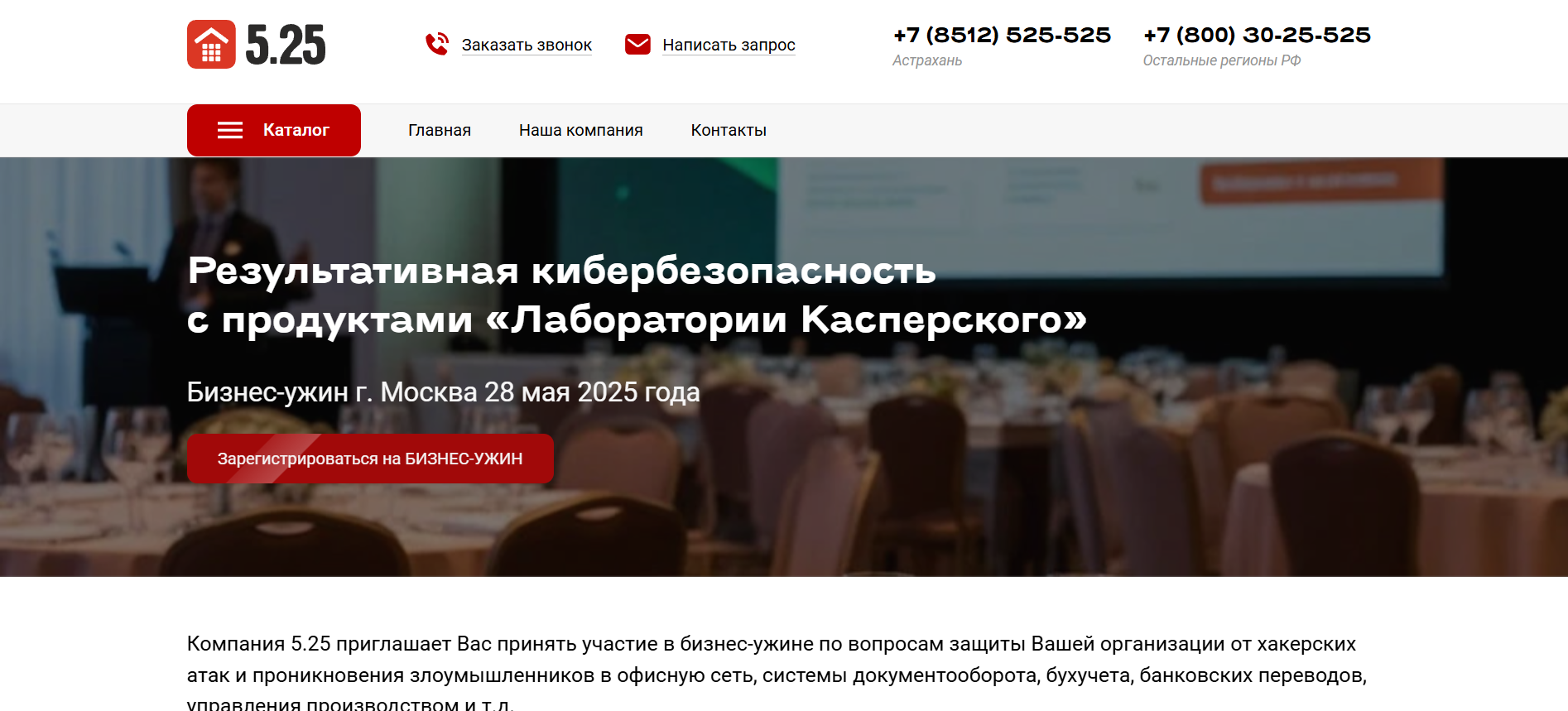 Компания 5.25 приглашает Вас принять участие в бизнес-ужине по вопросам защиты Вашей организации от хакерских атак и проникновения злоумышленников в офисную сеть, системы документооборота, бухучета, банковских переводов, управления производством и т.д.