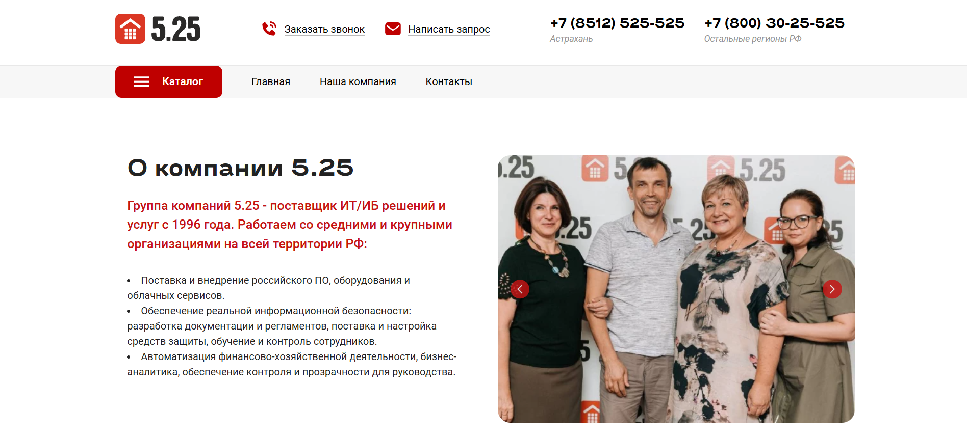 Группа компаний 5.25 - поставщик ИТ/ИБ решений и услуг с 1996 года. Работаем со средними и крупными организациями на всей территории РФ:
