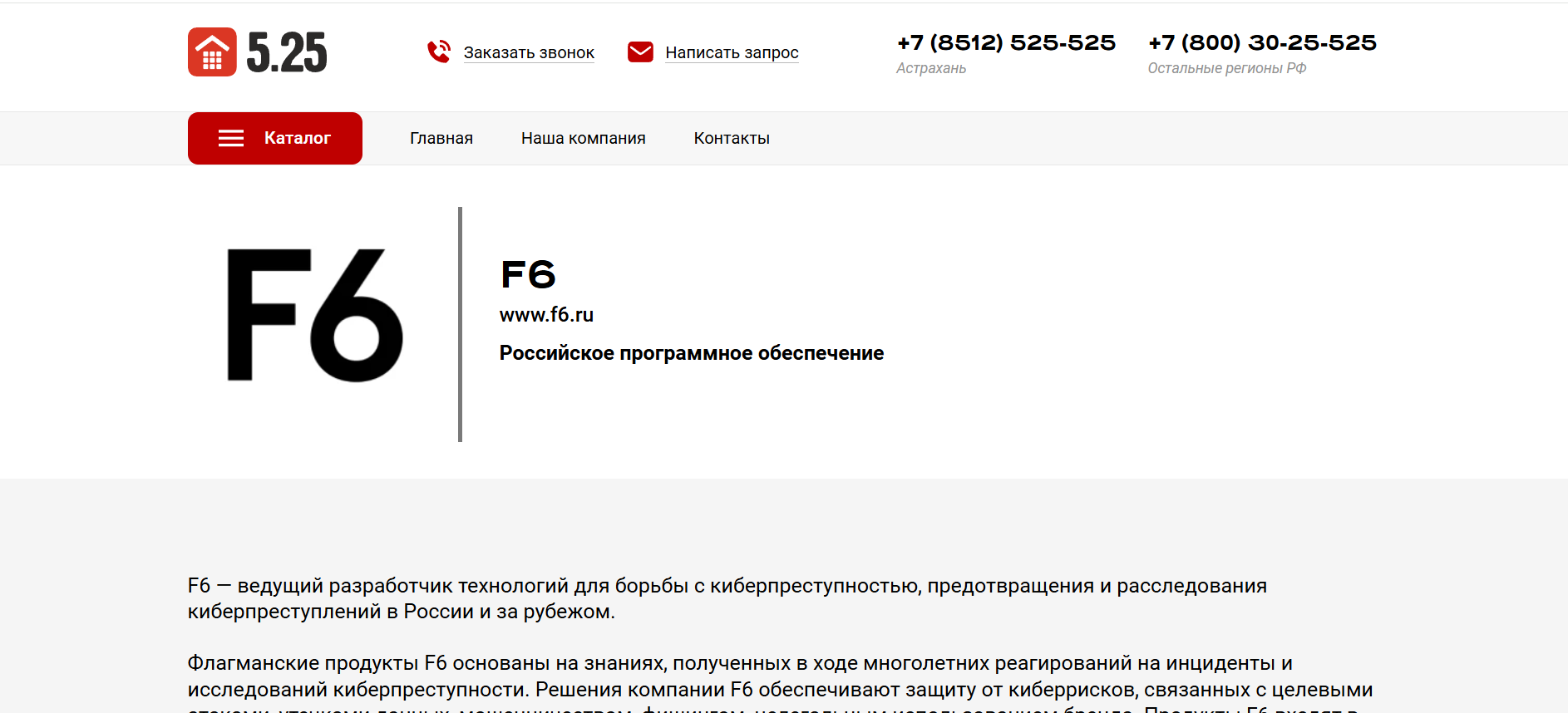 Флагманские продукты F6 основаны на знаниях, полученных в ходе многолетних реагирований на инциденты и исследований киберпреступности. Решения компании F6 обеспечивают защиту от киберрисков, связанных с целевыми атаками, утечками данных, мошенничеством, фишингом, нелегальным использованием бренда. Продукты F6 входят в реестр отечественного ПО.