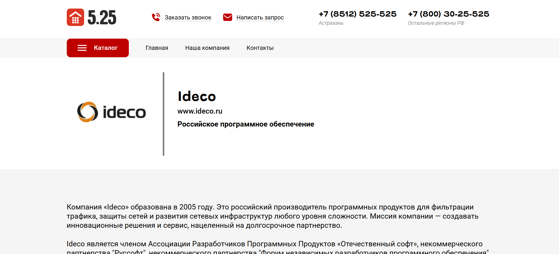 Компания «Ideco» образована в 2005 году. Это российский производитель программных продуктов для фильтрации трафика, защиты сетей и развития сетевых инфраструктур любого уровня сложности. Миссия компании — создавать инновационные решения и сервис, нацеленный на долгосрочное партнерство.